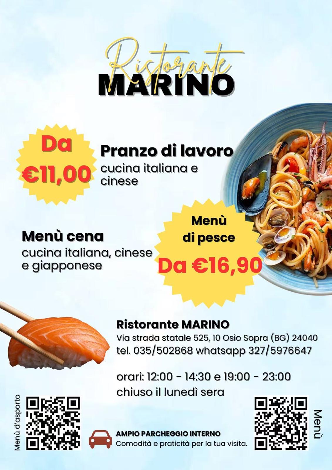 Il Ristorante Marino a Osio Sopra (BG) vi invita a un viaggio culinario sensazionale, dove i sapori dell'Italia e dell'Oriente si intrecciano in una sinfonia di delizie. Il nostro menu presenta una squisita fusione di classici italiani e gemme culinarie orientali, preparati con meticolosa attenzione ai dettagli e una passione per ingredienti freschi e di alta qualità.